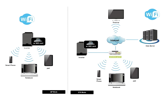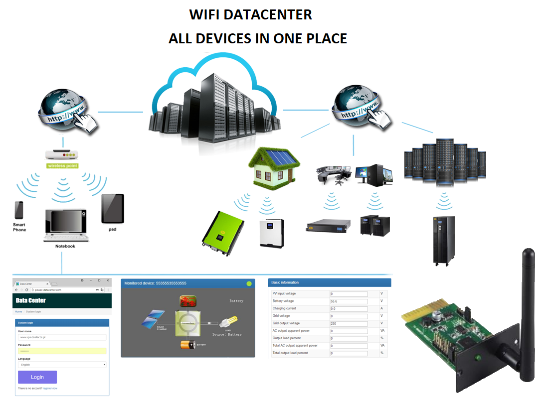 Wi-Fi kaart kogub andmeid ühendatud UPSilt või päikeseenverterilt ja saadab need pilvepõhisesse andmeserverisse, võimaldades reaalajas jälgida teie tegevust.